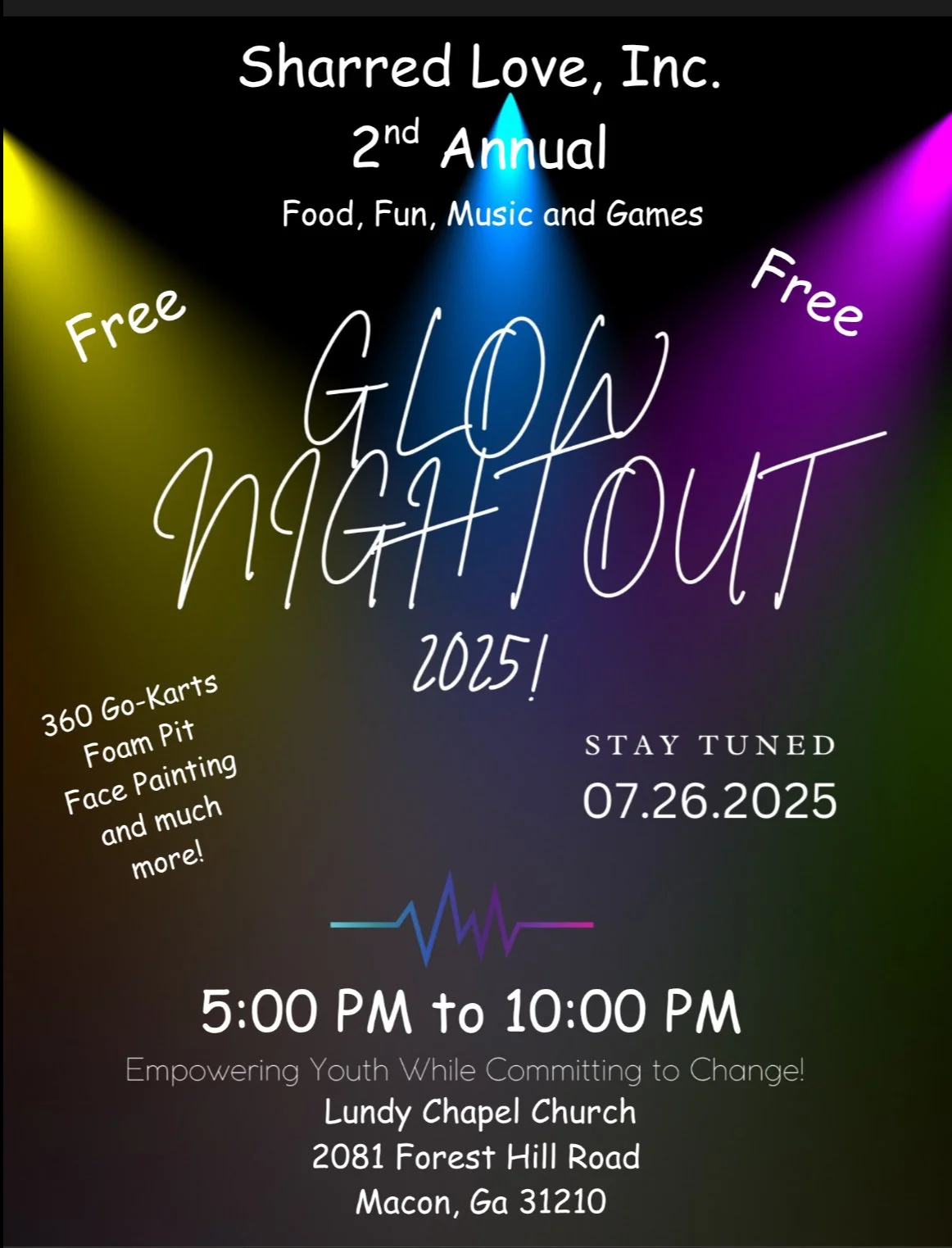 Join us July 26th, 2025 at Lundy Chapel Church 2081 Forest Hill Rd, Macon, GA. 31210 for our 2nd annual GLOW NIGHT OUT 2025. Come celebrate with us the ending of EMPOWERING 2025! for an evening of fun, food, and excitement.